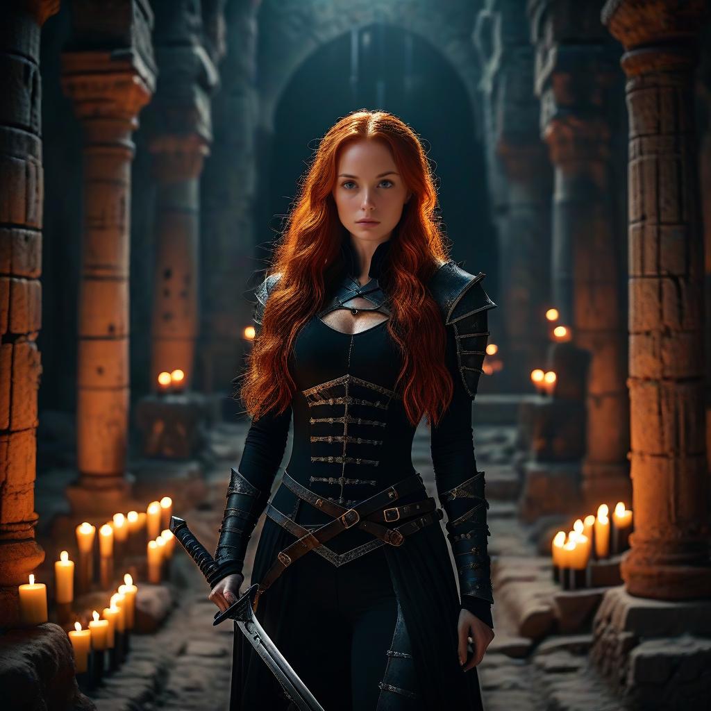 Night Photography a highly detailed cinematic photo of mysterious man with piercing green eyes in abandoned library with rows of lit black candles at different heights. He holds ancient tome in his hand. He wears a black tight bodysuit, 50 mm lens, f/2.4, accent lighting, global illumination, Nikon D810