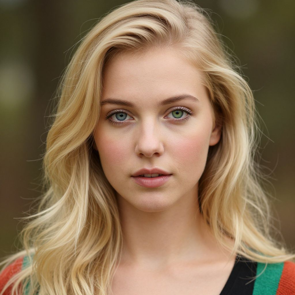 The image features a hyperrealistic headshot of a blonde woman with a soft, ethereal quality. Her hair is long, wavy, and golden, cascading down her shoulders. The woman's skin is smooth and has a natural, healthy glow, with a subtle blush on her cheeks. Her eyes are striking, with one eye having a blue hue and the other a green tint, adding a unique and captivating element to her appearance. She is wearing a casual outfit, with a top that has a mix of red, green, and black colors, which contrasts nicely with her fair skin and blonde hair. The background is blurred, focusing attention on the woman's face, and appears to be a natural setting, possibly a garden or forest, with soft, diffused lighting that enhances the overall serene and tranquil atmosphere of the image.