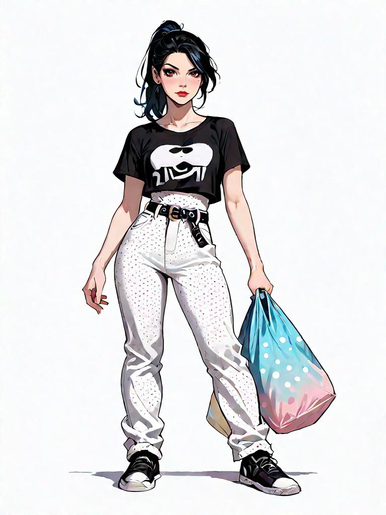 Illustration of a young woman with a realistic face, dressed in casual streetwear. She wears a cropped black t-shirt with a graphic design, white mid-rise polka dot paperbag waist trousers with a tied black belt, and black sneakers with white stripes. Her hair is styled in a ponytail and she has simple makeup. She is standing on a plain white background holding a pastel-colored polka dot shopping bag.