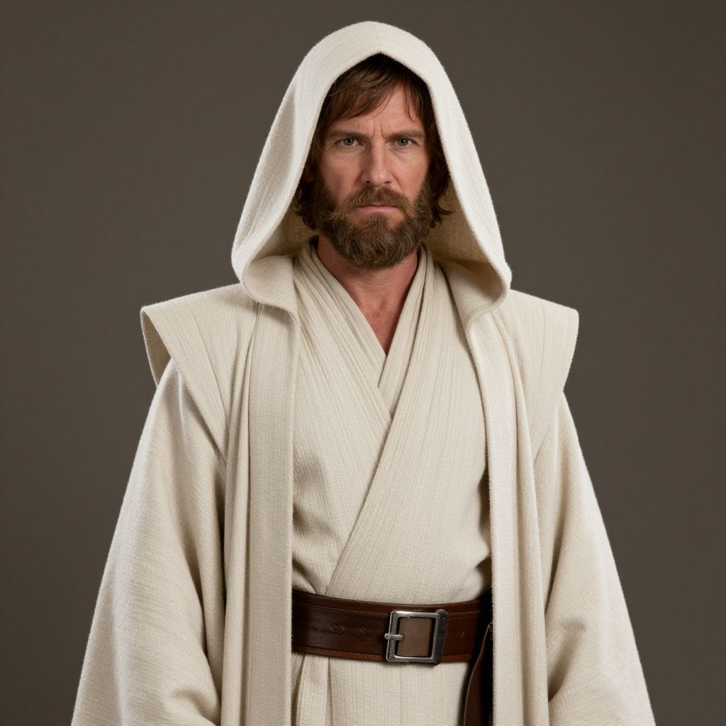 Authentic adult jedi costume, 1boy, solo, male focus, robe, facial hair, hood, beard, standing, looking at viewer, old, hood up, old man, closed mouth