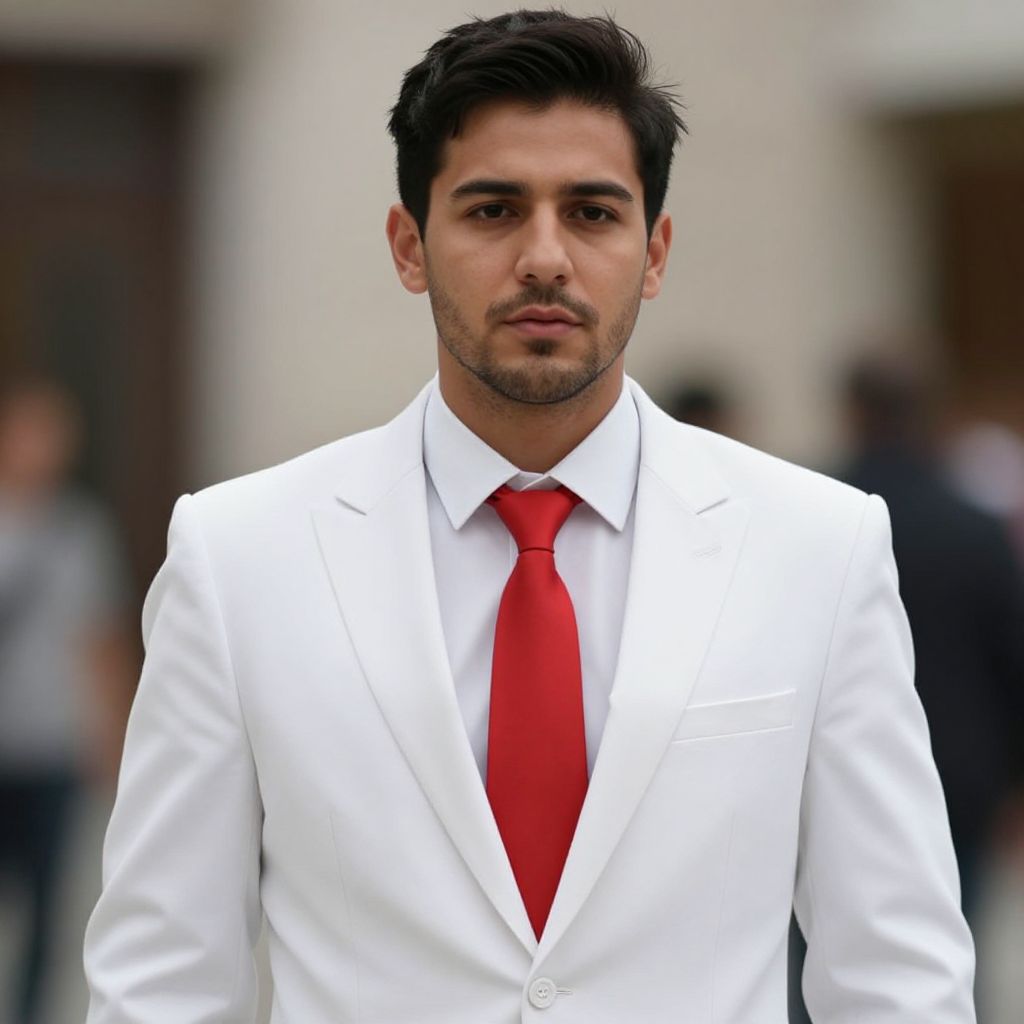 Photograph of a young man with short, dark hair and light brown skin, standing outdoors. He has a serious expression and a trimmed beard. He is wearing a crisp white suit jacket over a white dress shirt, paired with a bright red tie. The background is slightly blurred, showing indistinct figures and a beige building, suggesting an urban setting. The contrast between the white suit and red tie draws attention to his formal yet striking appearance.