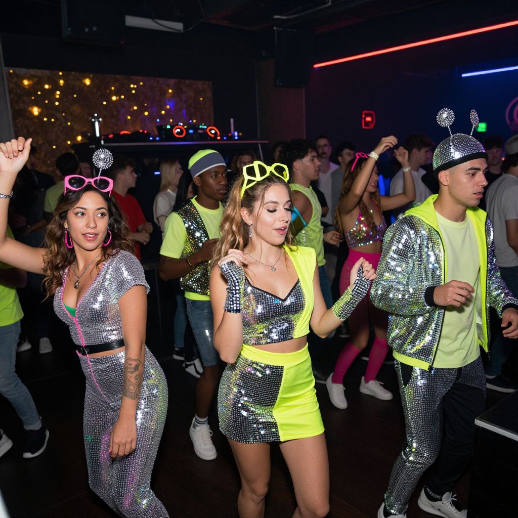 A group of friends wearing matching disco costumes with neon colors and sparkly accessories, dancing in a crowded nightclub with flashing lights and a DJ booth in the background.