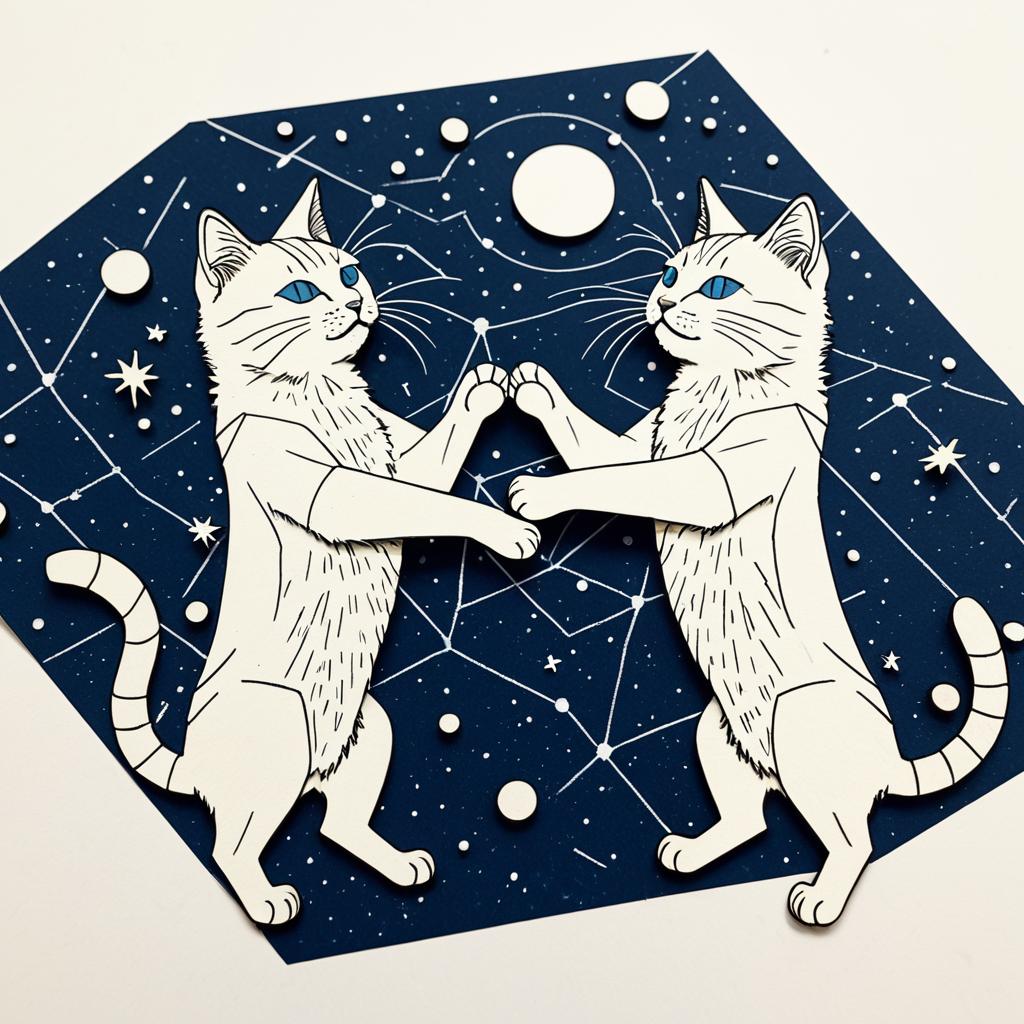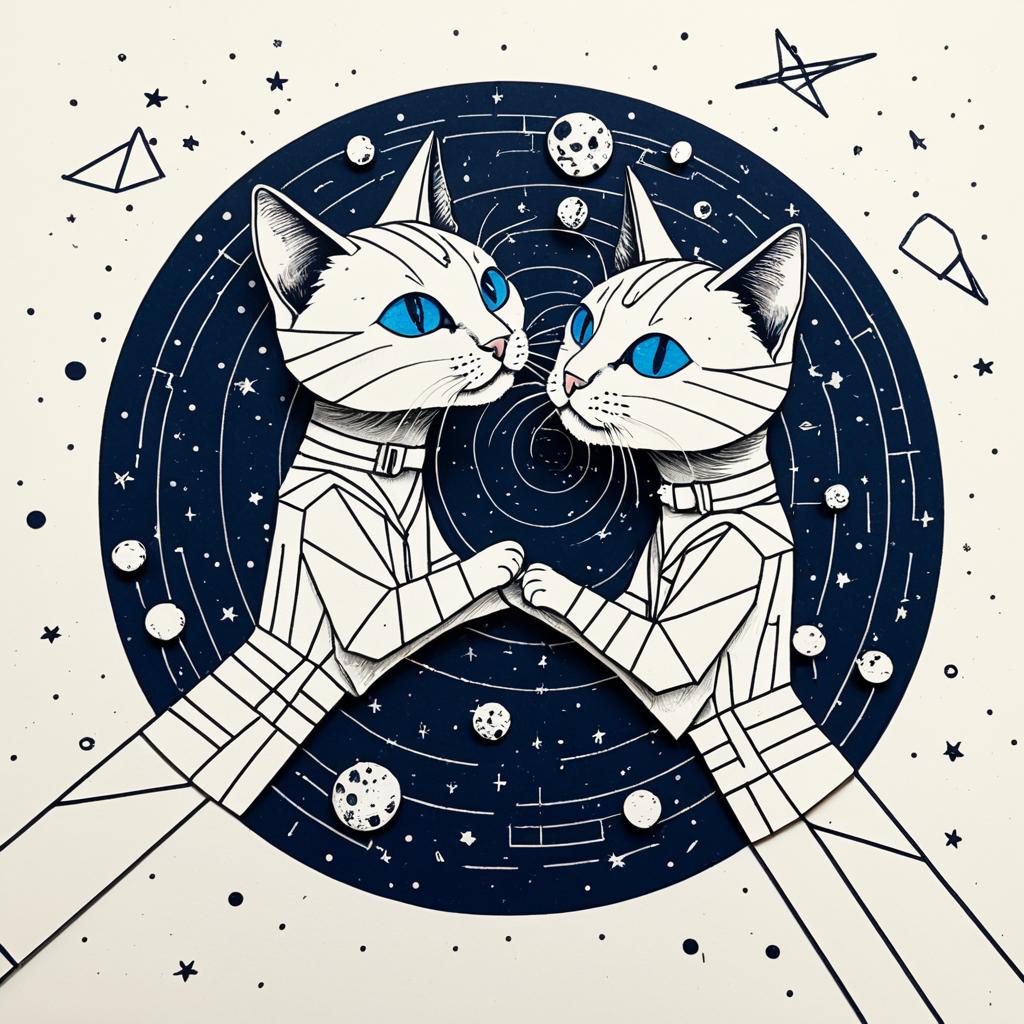 Abstract minimalist illustration of two white cats with blue eyes floating in a dark blue space filled with geometric lines and dots resembling stars. The cats have elongated bodies disappearing into the distance, facing each other with detailed hands reaching out towards them from the bottom, all designed in a paper cutout style with distressed texture and noise effects.