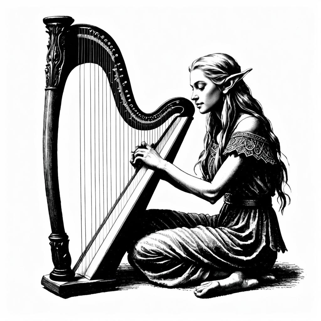 Black and white stipple ink drawing of a serene elf woman with pointed ears, long flowing hair, and a detailed corset dress, seated on a carved wooden stool, playing an intricately carved harp. The full-body image features high contrast and sharp focus, emphasizing detailed textures and shadows on the elf’s attire and harp.