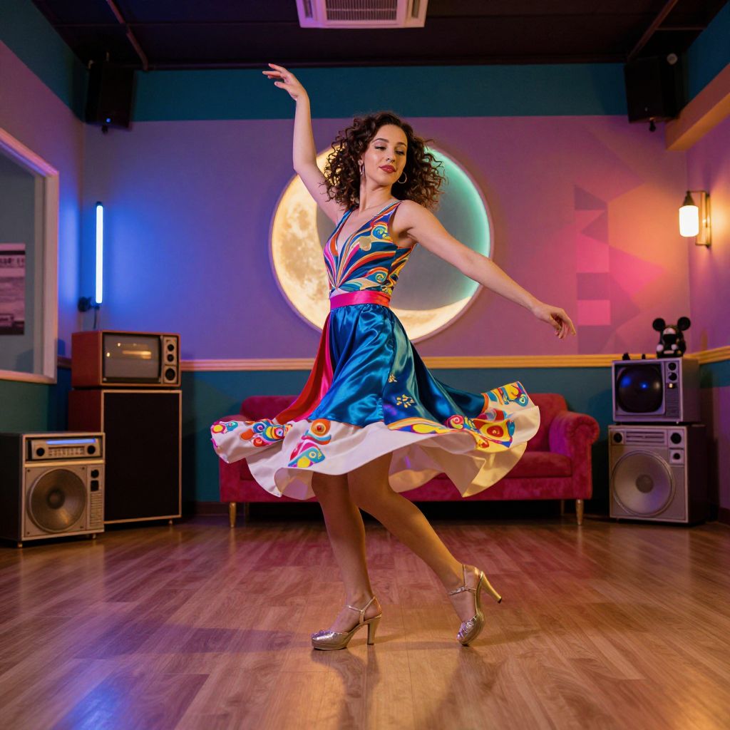 Photograph of a curly-haired woman dancing in a colorful, retro-style room. She wears a vibrant, sleeveless dress with a blue, red, and white pattern, and silver high-heeled shoes. Her dress flutters as she moves, arms gracefully raised. The background features a large, illuminated circular moon-like light on a teal wall, with neon blue and orange lights. Two vintage speakers and a red couch are positioned symmetrically on either side. The wooden floor reflects the colorful lights, adding to the lively atmosphere. The overall style is reminiscent of 1970s disco, with a modern, playful twist.