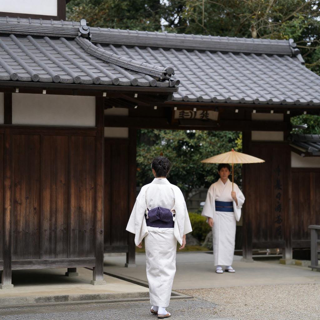 Photograph of a traditional Japanese scene. A person in a white kimono walks away from a wooden building with a tiled roof. Behind them, another person holds a straw umbrella, standing under a shaded porch. Trees in the background.