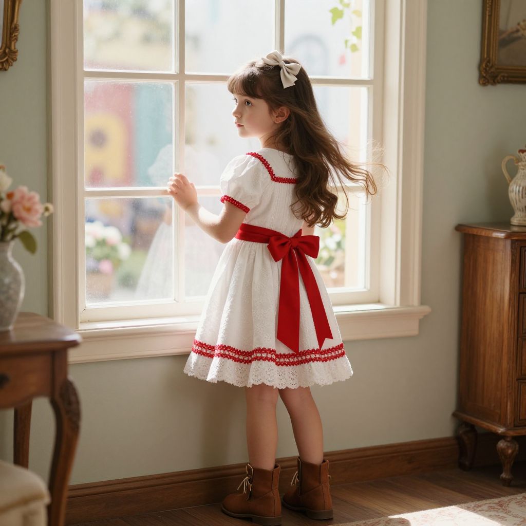 A young girl with long, flowing brown hair, wearing a beautiful white and red dress with a vibrant red sash tied around her waist, and stylish brown boots. She has a delicate bow pinned on her head, adding a touch of charm and elegance. She is standing confidently in front of a large, bright window, looking out with a soft, curious expression. The window shows a colorful, sunlit interior with soft light filtering through, casting gentle shadows. The scene is warm and inviting, set in a cozy, vintage-style room with wooden furniture and floral decorations, giving a nostalgic, fairy-tale atmosphere.