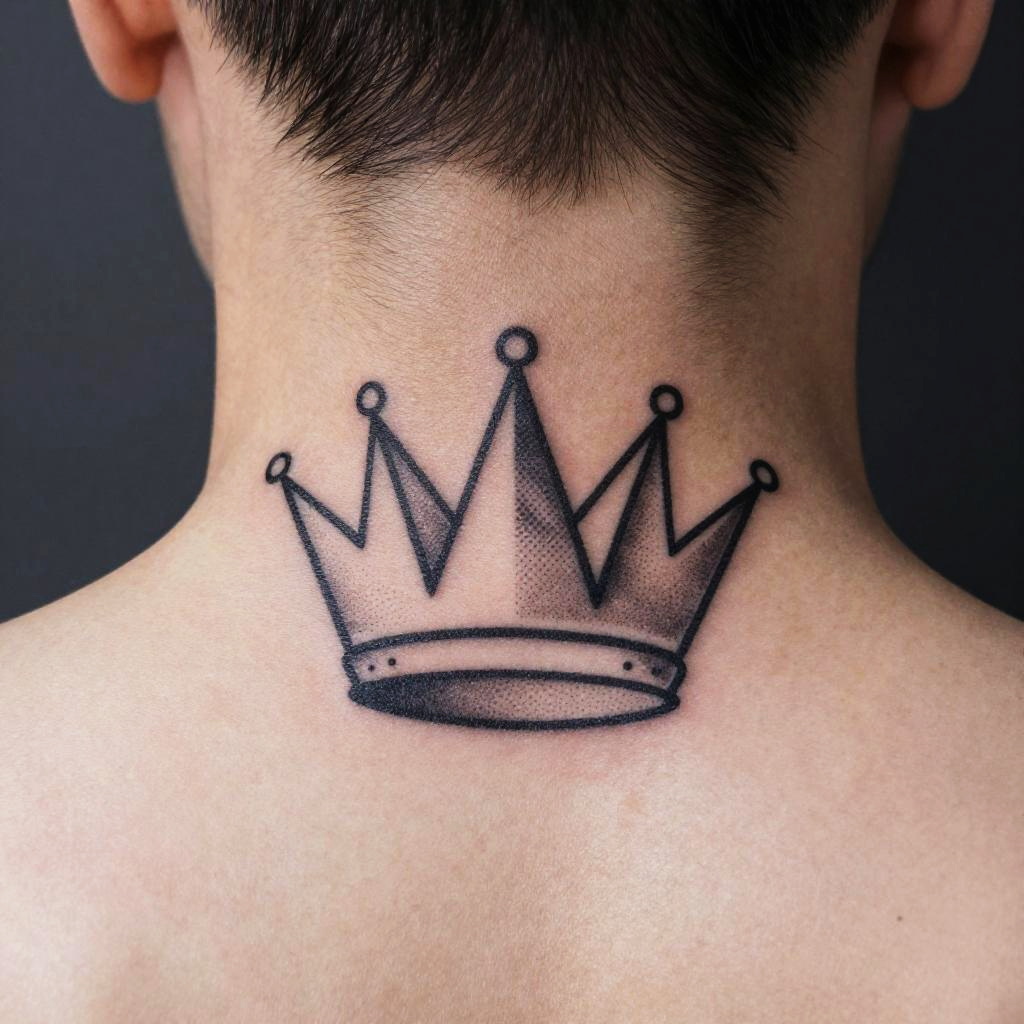 Tattoo crown designs depicting a minimalist geometric crown, fine line work and dot shading in monochrome, placed on the back of the neck for a modern look