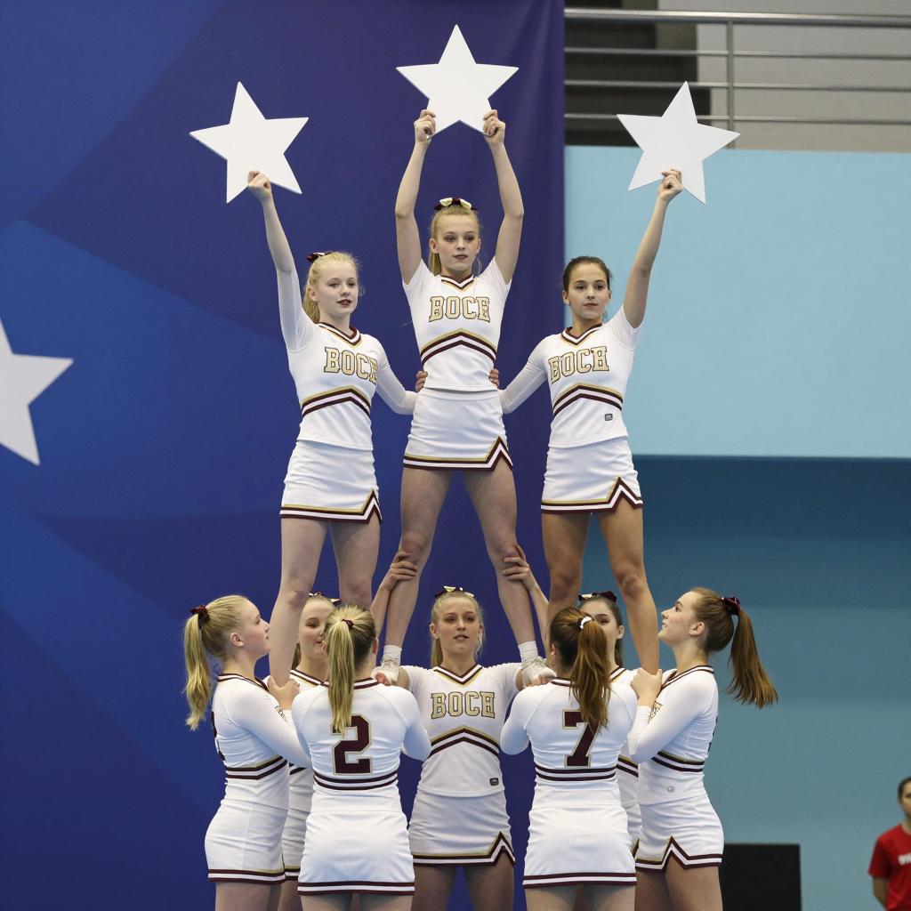 Cheerleaders in red and black uniforms with "RCH" on chest. Three women in front, two men in back. Women wear sleeveless tops, men wear shirts. Women's hair in buns, men's hair short. All have clenched fists. Background has "REGIONAL CHAMPIONS" sign. All have serious expressions. Five people in total.