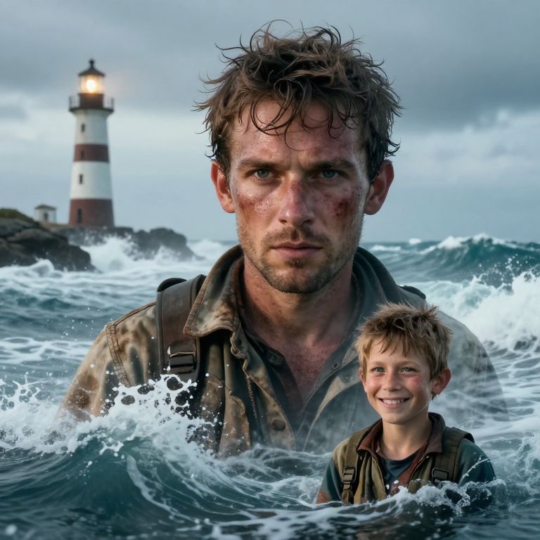 Photograph of a rugged, wet-haired man with a serious expression and slight beard, wearing a camouflage jacket, standing in turbulent ocean waves. Beside him, a smiling young boy with similar wet, tousled hair, wearing a dark shirt, stands close. In the background, a tall, white and red striped lighthouse is illuminated against a cloudy, overcast sky. The ocean's waves are splashing around them, adding dynamic movement to the scene. The overall mood is dramatic and adventurous, with the lighthouse suggesting a coastal setting.