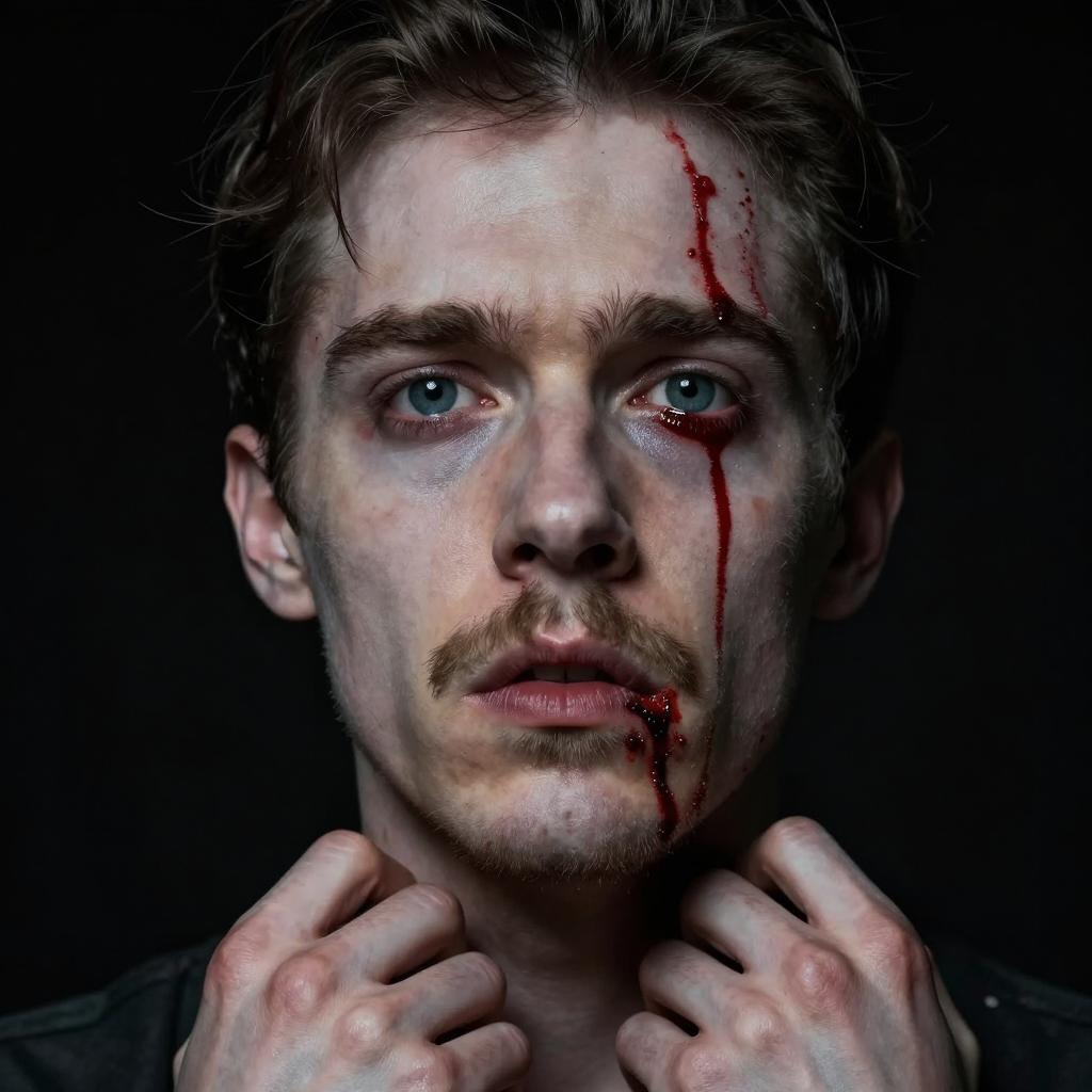 Male with pale skin and dark hair, blood streaming from his forehead and eyes, hands gripping his neck. Intense, wide-eyed expression. Black background. Blood on his mustache and lips. Photorealistic style.