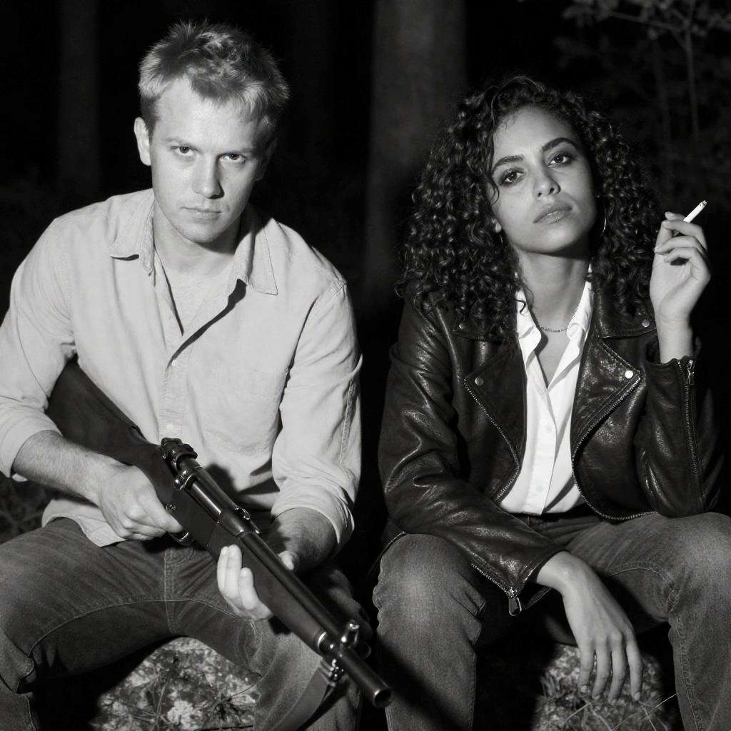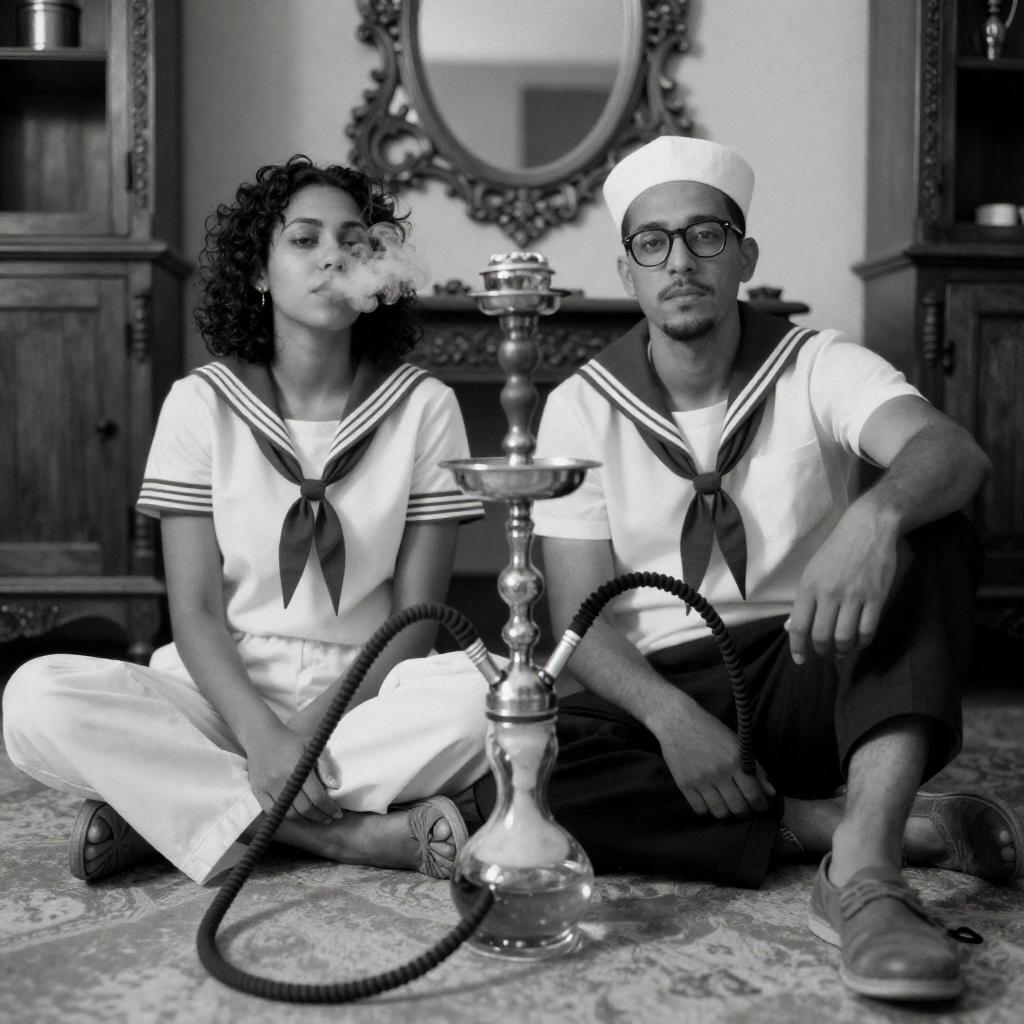 Black-and-white photograph of two people in sailor outfits, sitting on the floor with a hookah between them. Both are smoking pipes. The woman with curly hair and a neutral expression, the man with glasses and a white cap, both looking at the camera. Ornate mirror and carved wooden furniture in the background. Coiled ropes and a glass base on the floor.