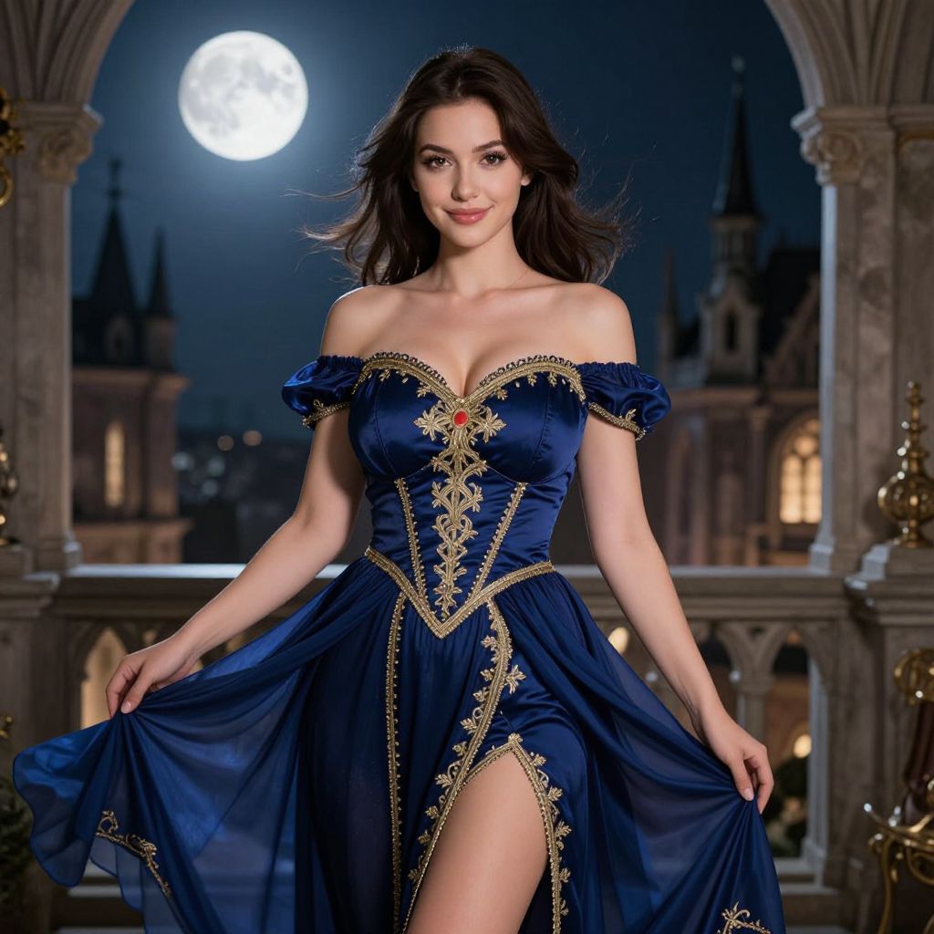 Photograph of a smiling brunette woman with fair skin and dark wavy hair, standing in a nighttime setting. She wears an off-the-shoulder, deep blue, satin dress with gold embroidery and red gemstones, featuring a high slit on her left thigh. The dress is flowing and she holds the sides gently. The background includes a full moon, Gothic-style architecture with pointed spires, and arched columns. The scene is illuminated by soft moonlight, creating a magical, fairy-tale atmosphere. The woman's physique is slender with a modest breast size.