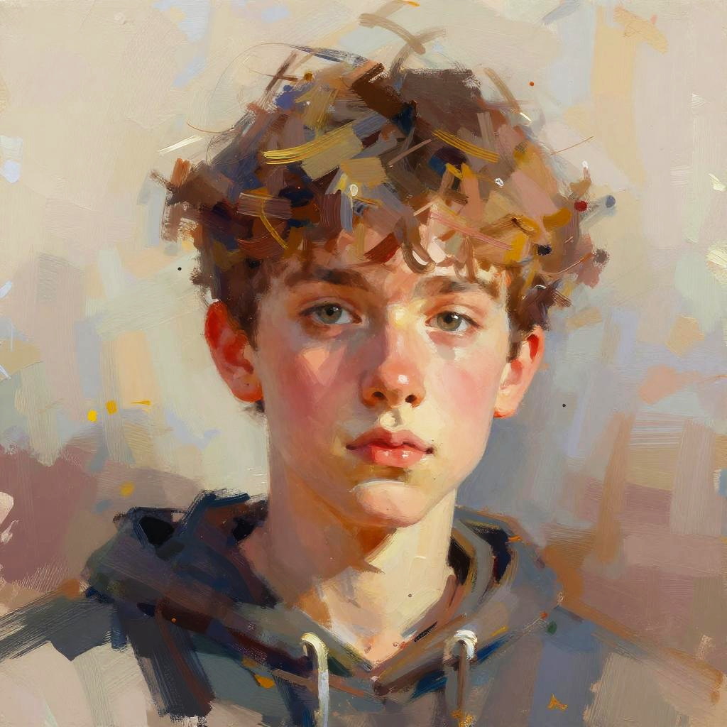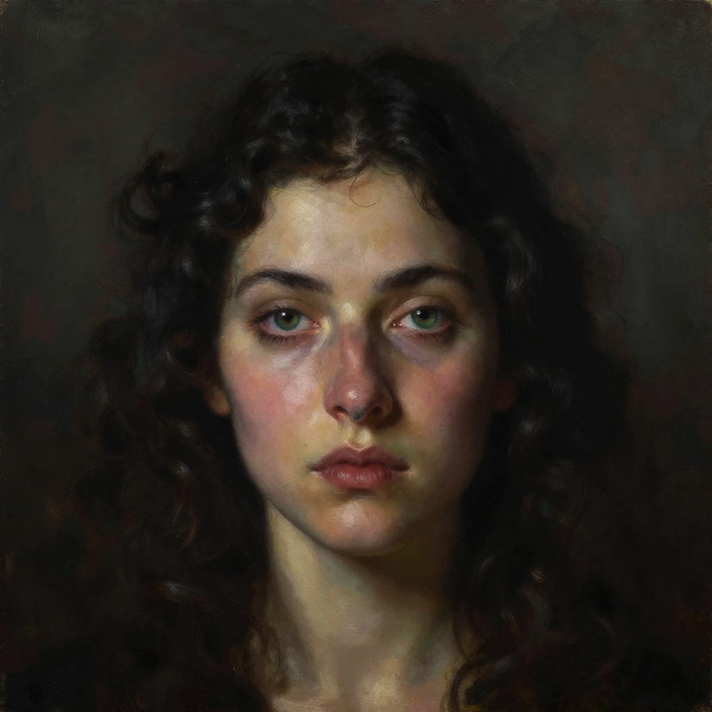 Retrato artístico de un hombre con mirada penetrante, estilo pintura al óleo, textura rica y colores profundos, expresión intensa y fondo abstracto en tonos cálidos.