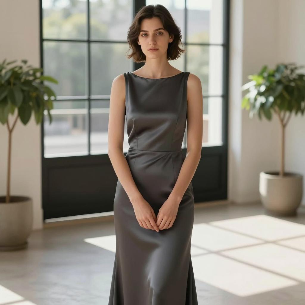 Woman in green satin dress with side slit and cutout, black high heels, leaning against white window frame, arms raised, head tilted back, legs crossed, sunlight through windows, green plants outside. Light wooden floor. Photographic style.