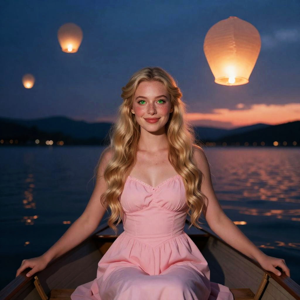 Masterpiece, perfect lighting, night, dusk, cinematic lighting, adult, female, looking at viewer, green eyes, smile, :), freckles, blush, solo, (RSEEmma:1.5), (RapunzelWaifu:1.2), pink dress, blonde, very long hair, (lake:1.35), in rowboat, (multiple flying sky paper lantern:1.48), horizon, hills, (sunset:1.1)