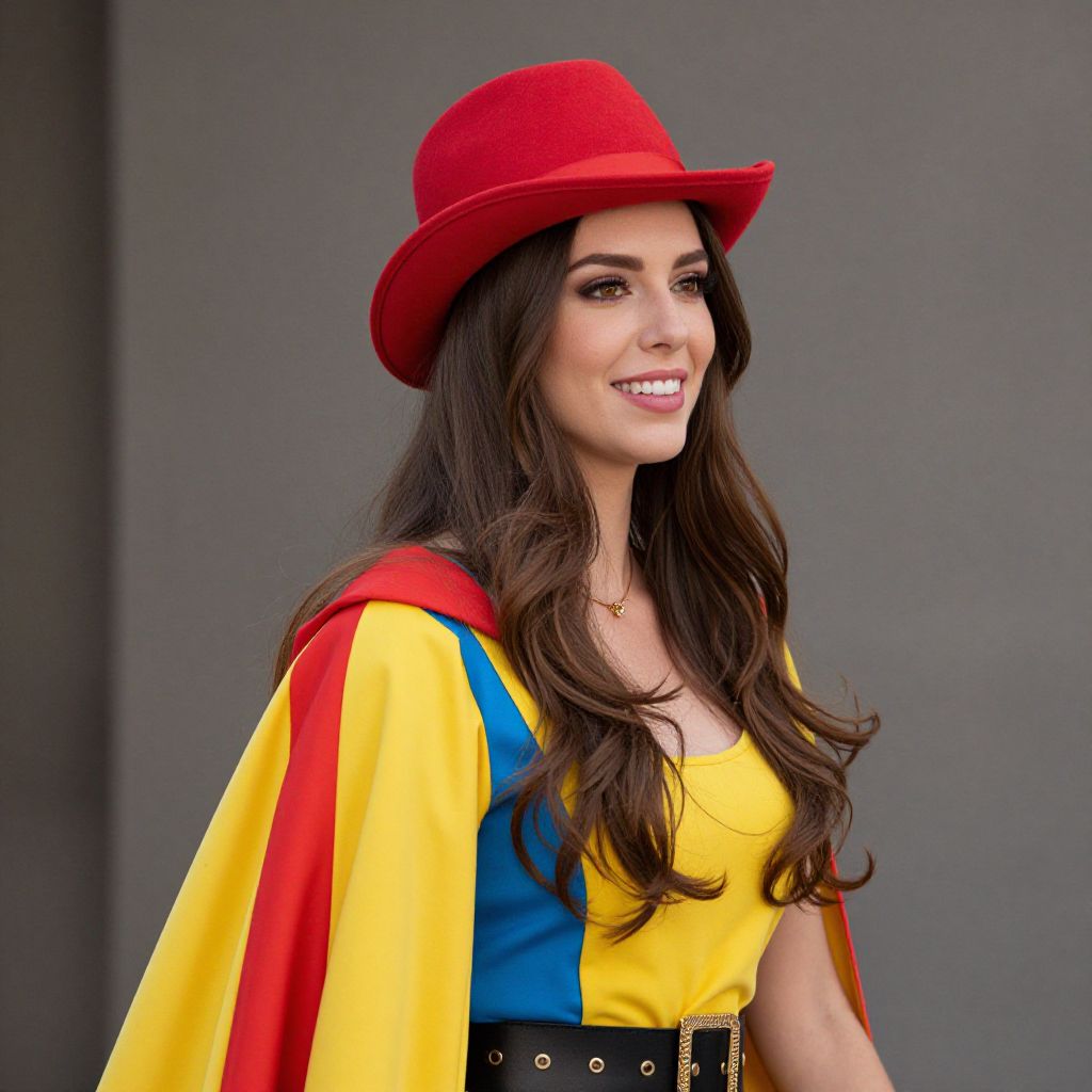 A woman with long brown hair is wearing a colorful outfit with a red and yellow cape and a red hat.