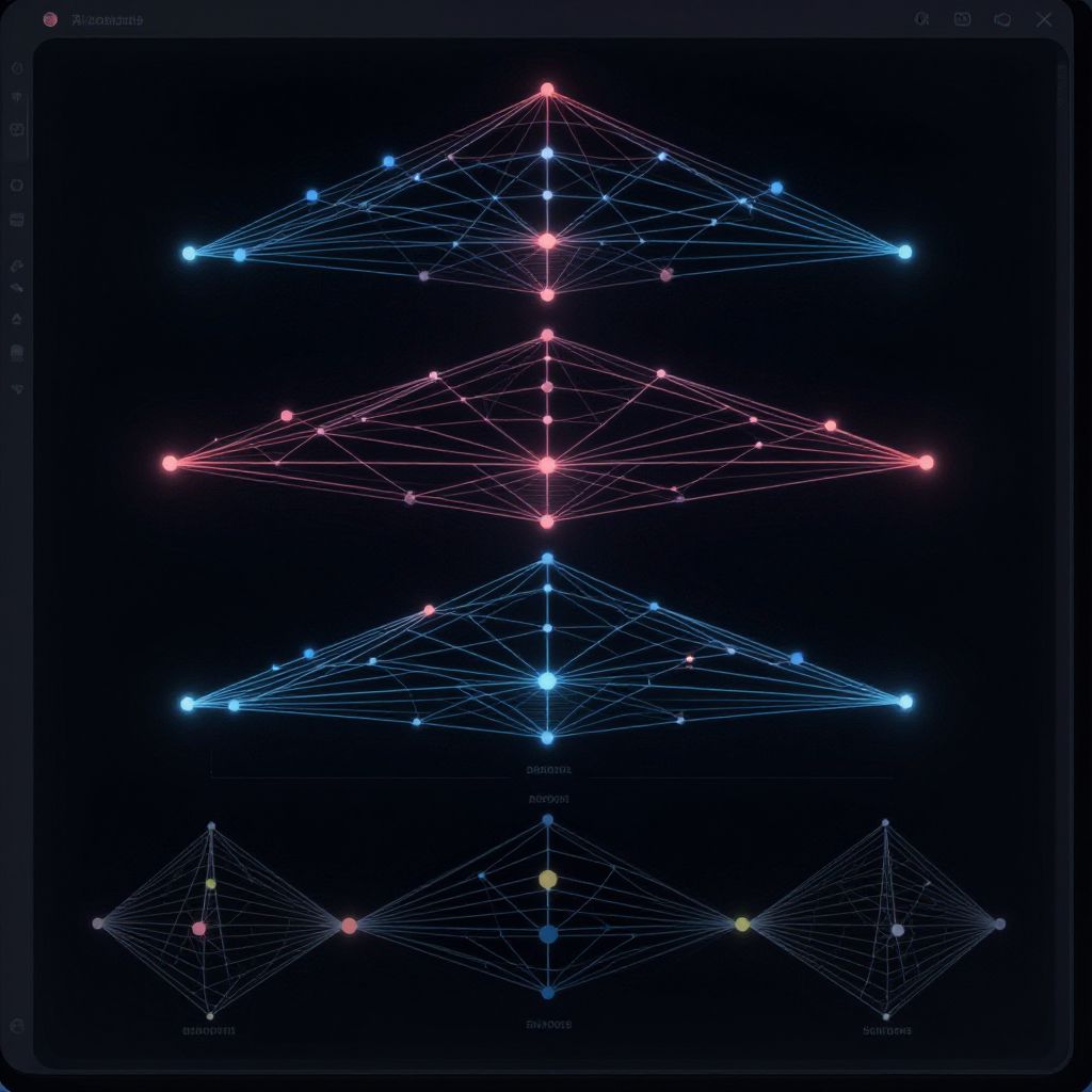 Controlnet webui visualization presenting complex AI model architecture, layered network diagrams, gradient glowing edges, dark background, detailed modern interface for neural network control