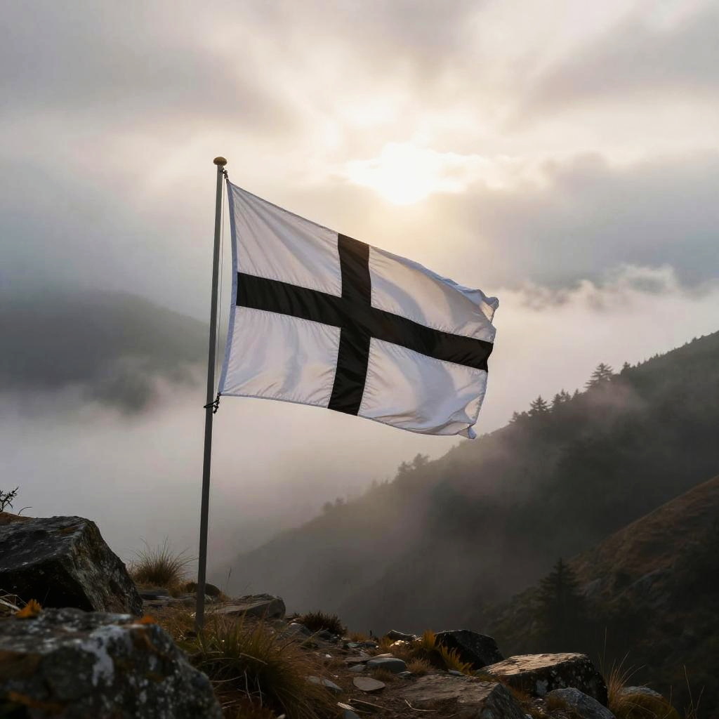 White flag black cross fluttering above a foggy mountain pass, early morning light breaking through clouds, mystical and serene atmosphere, sharp landscape details