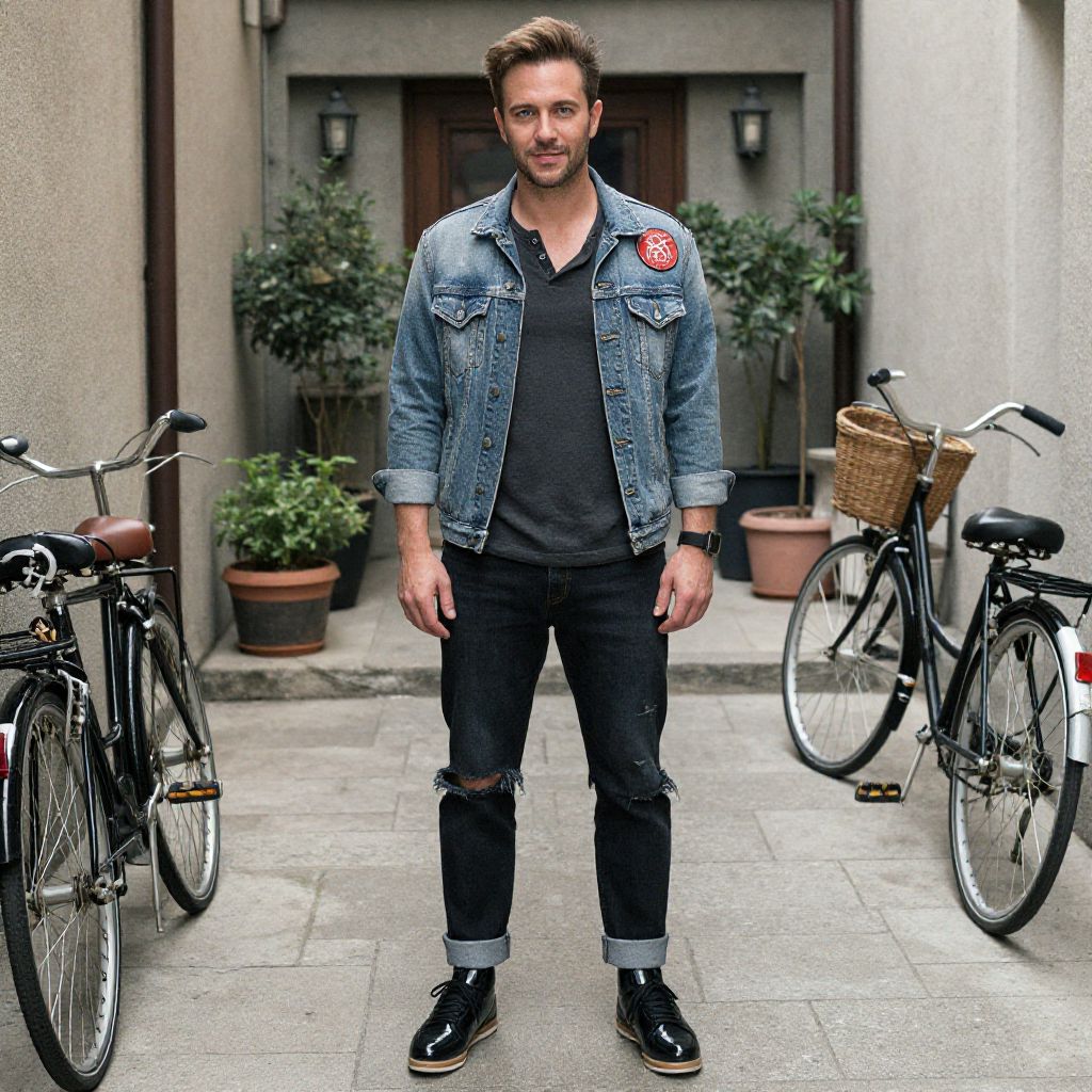 A man, charcoal Henley shirt, ripped cuffed jeans, sleek black skate shoes, denim jacket with patches, quaint alleyway, vintage bicycles parked, potted plants lining the entrance, lithographic film style, relaxed smile, casual confidence. Man has masculine face and piercing eyes