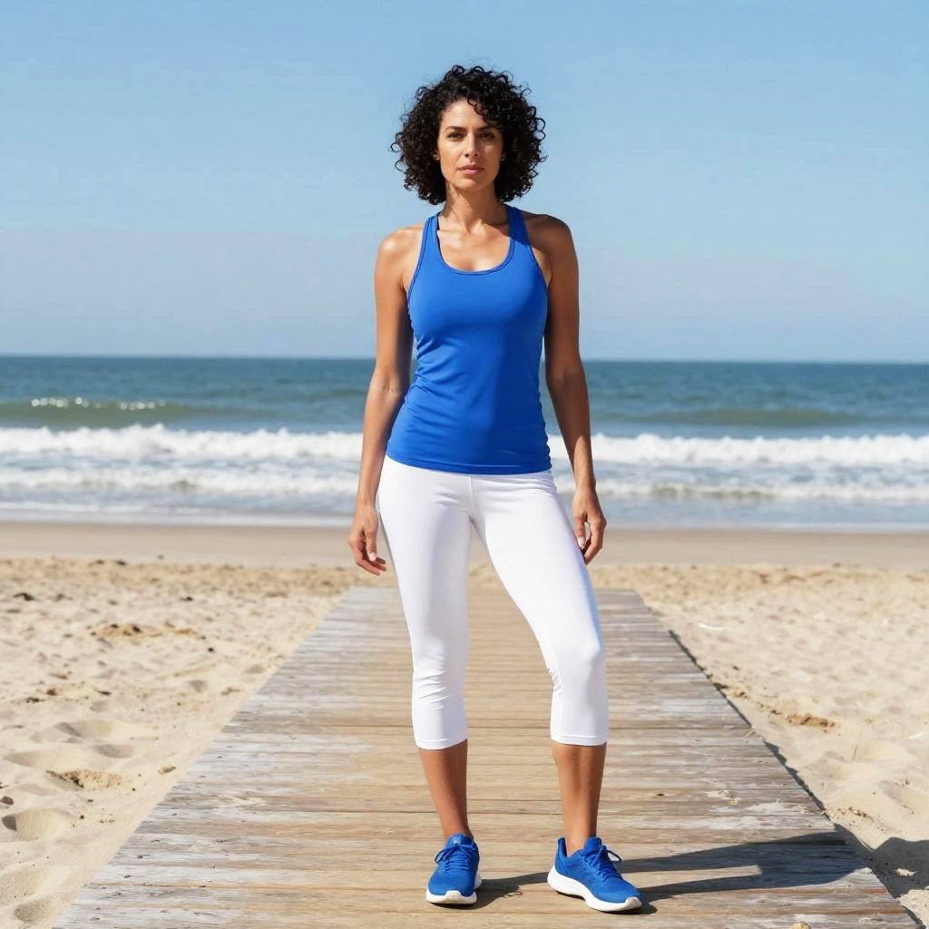 Photograph of a fit woman with dark skin and braided hair, wearing a neon yellow sports bra, purple capris, and pink sneakers, standing
