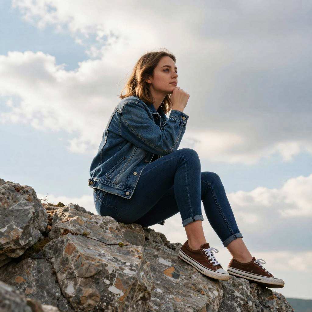 Photograph of a young woman with light skin and brown hair, mid-jump against a bright blue sky with fluffy white clouds. She wears a white long-sleeve shirt, black vest, blue jeans, and black boots. Her eyes are closed, and she has a joyful expression. Her arms are outstretched, and her legs are bent at the knees, creating an energetic and carefree pose. The sunlight highlights her features and clothing, casting subtle shadows. The image captures a sense of freedom and exuberance.