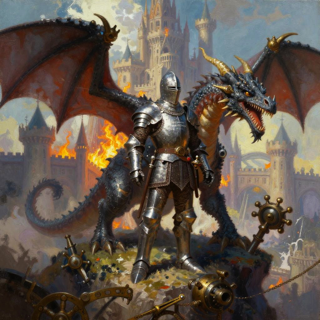 Realistic photo.Island A brave knight and dragon, standing together in a steampunk fairyland, inspired by Frank Frazetta, Boris Vallejo. Features heroic poses, dynamic composition, a backdrop of castles and flames, with bold colors, oil painting. realistic photo