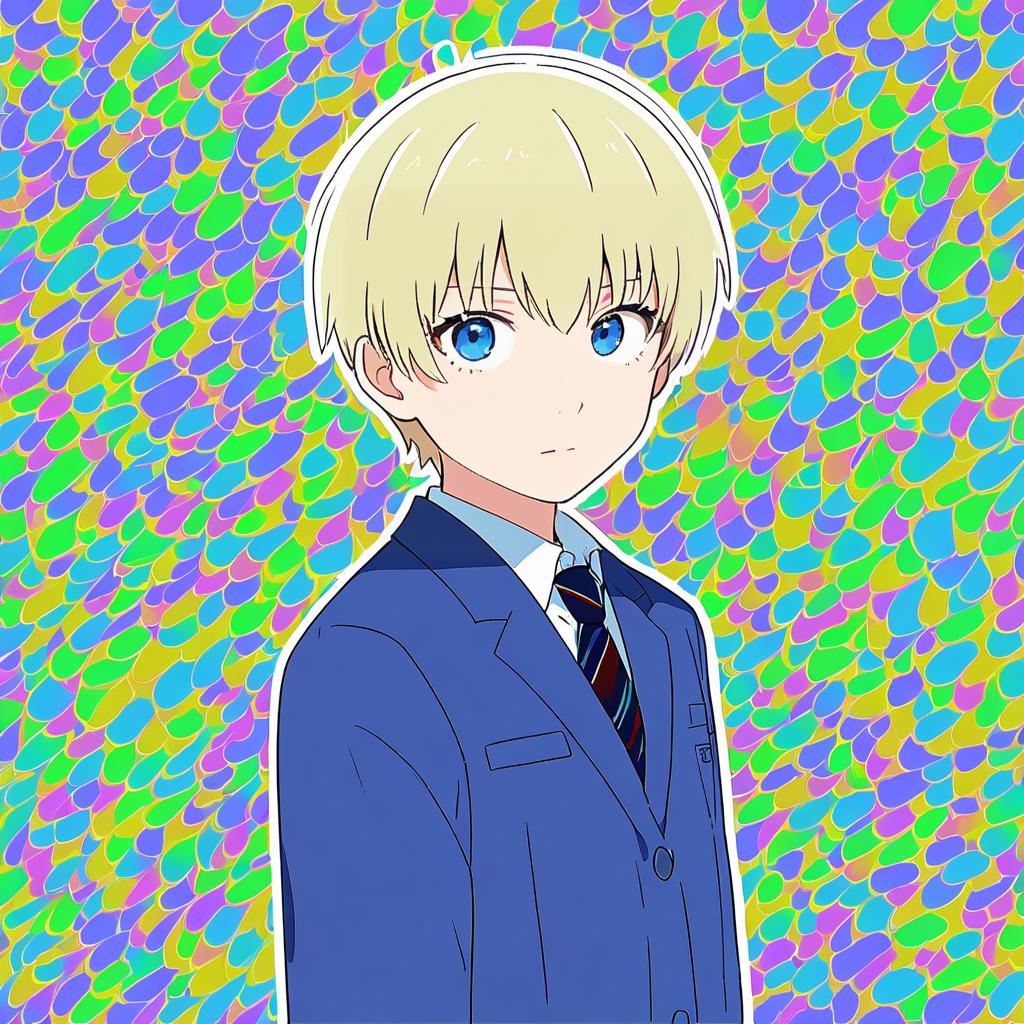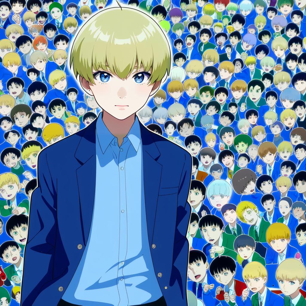 Hanazawa teruki, mob psycho 100, 1boy, blue eyes, short hair, blonde hair, school uniform, collared shirt, school uniform, long sleeves, blazer, by artist umikochannart, anime