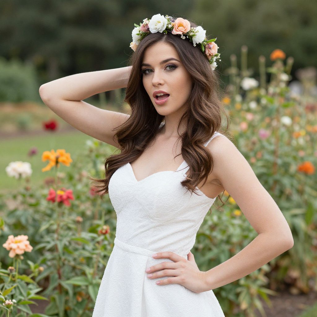 Photograph of a beautiful brunette woman with wavy hair, wearing a white floral headband and dress, standing in a vibrant garden with colorful roses.