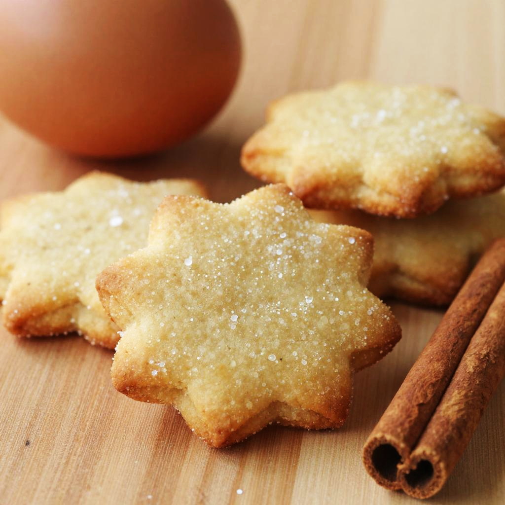 A close-up photo of sugar-coated gingerbread cookies and cinnamon sticks on a wooden surface. The cookies are golden brown with a crunchy texture, covered in white sugar crystals. A single brown egg is partially visible in the background, adding a subtle touch of color. The cinnamon sticks have a rich, warm brown hue and a slightly rough texture. The overall scene feels cozy and inviting.