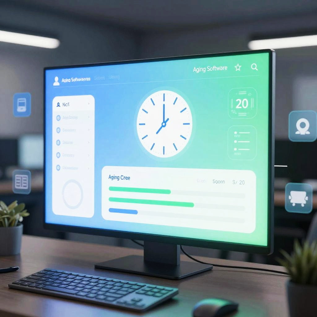 Aging software free interface displayed on a futuristic holographic screen, showcasing user-friendly design with soft blue and green gradients, digital clock and progress bars, surrounded by floating data icons, modern tech environment, vibrant and sleek style