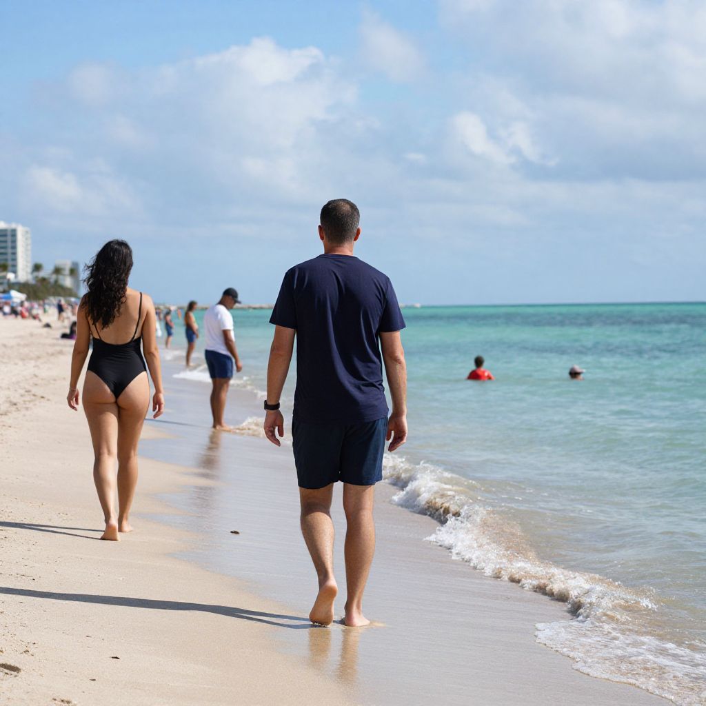 Sunny day at Delray Beach on March 20, 2020, featuring a man walking barefoot along the shoreline, a woman in a swimsuit strolling nearby, and several people enjoying the turquoise waters and sandy beach under a partly cloudy sky.