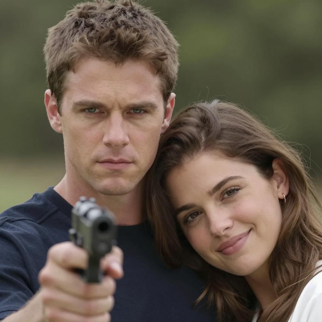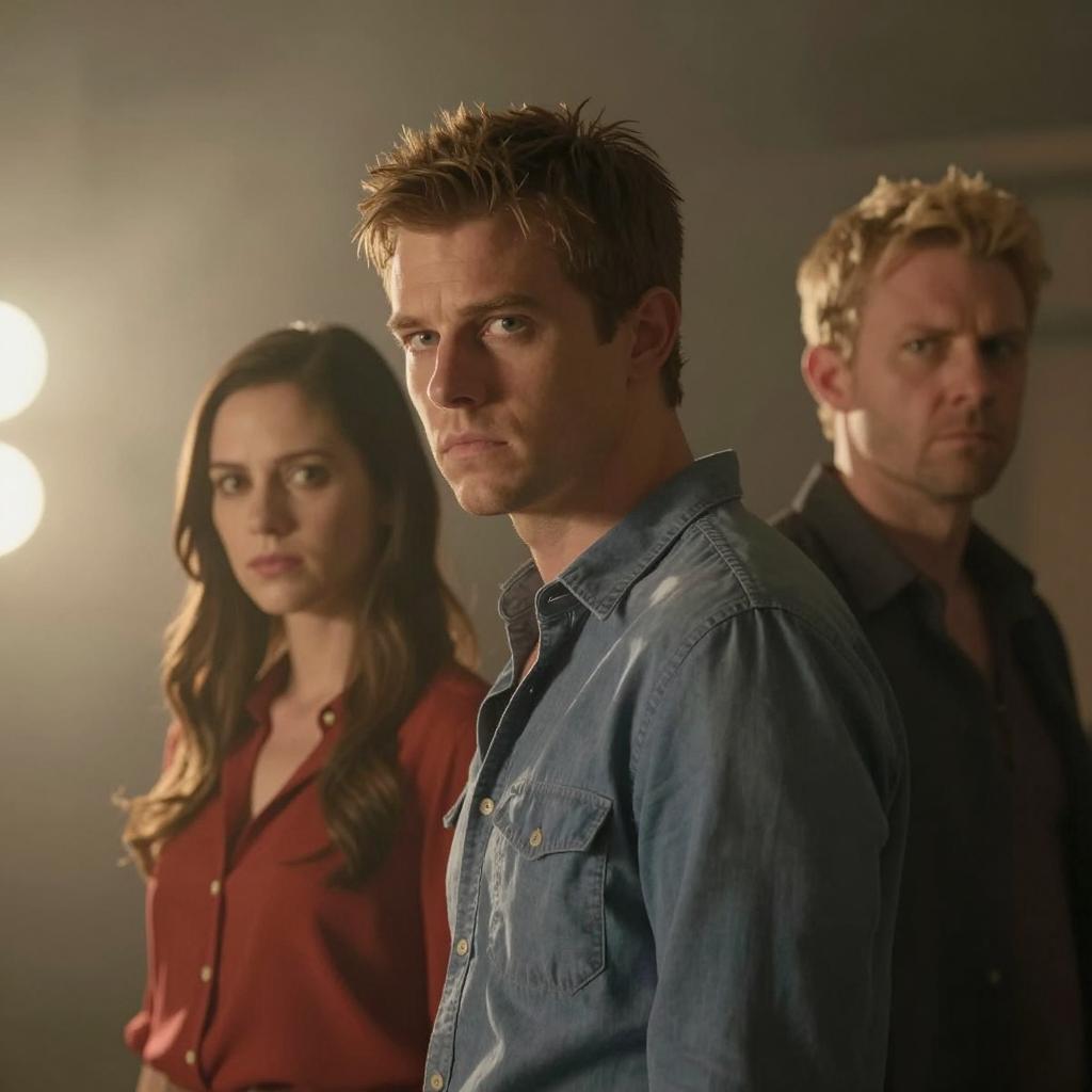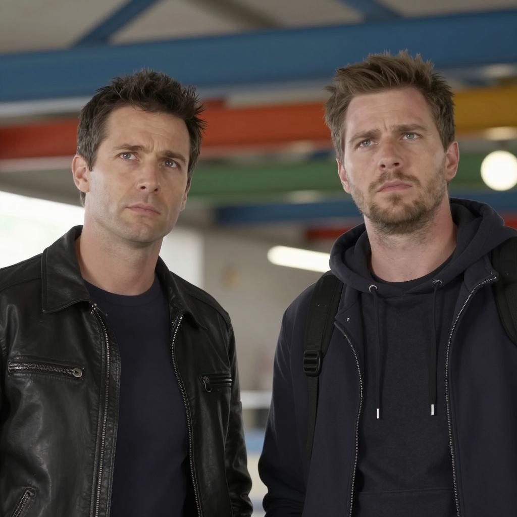 A man and woman standing close together in front of a vintage microphone. The man has short dark hair, a strong jawline, and is dressed in a black leather jacket over a black shirt with an open collar. The woman has long wavy brown hair, wearing a matching black leather jacket and a black top. Warm lighting creates a soft glow in the background with vertical lines, highlighting their serious expressions. Both subjects are positioned in the foreground, the man facing forward and looking to the right, while the woman looks slightly to the side.