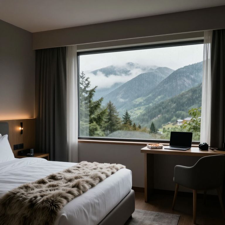 The image depicts a large hotel room with a window that offers a breathtaking view of mountains and trees on a rainy day. The room is illuminated by natural daylight filtering through the window, creating a serene and inviting atmosphere. The bed, covered with lush white sheets and a cozy furry throw blanket, is positioned to the left of the frame. A desk by the window holds a laptop, a pizza box, a pack of cigarettes, and a camera, suggesting a blend of work and leisure. The room's low ceiling adds to the intimate and comfortable feel of the space. The overall composition is cinematic and photorealistic, with detailed textures and colors that enhance the realism of the scene.