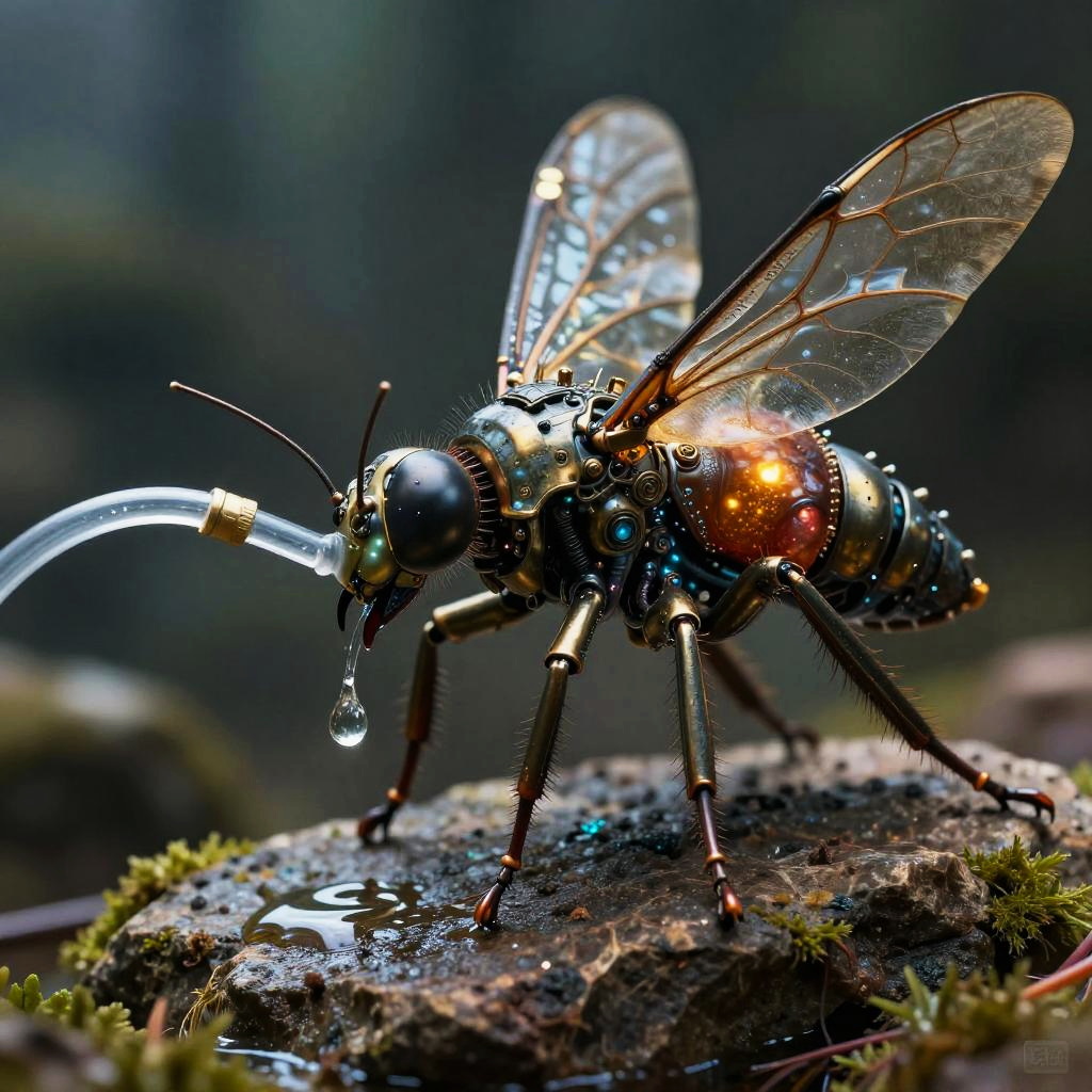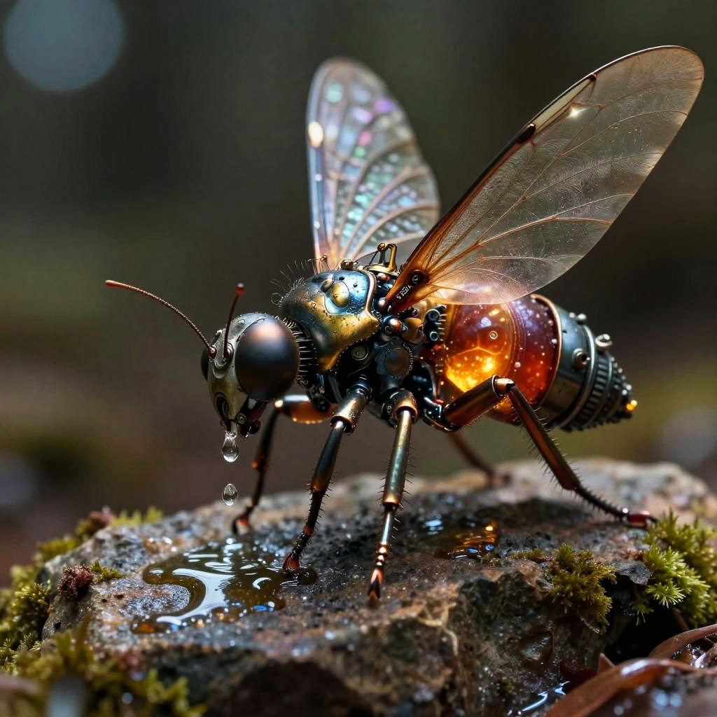 Macro close-up side view photograph of a bizarre creature fusion of insect, machine, soft-bodied animal, composite materials, artificial nerves, artificial muscles, and titanium alloy, juicy, glowing, mechanical joints, intricate bronze elements, ((thin film of oil on metal)) (Cybernetic enhancements:1.4), (Bioluminescent abdomen:1). on a rock, (drinks a drop of water) water droplet on the rock, (moss:0.6), (large beautyful intricate transparent wings:1.4), (by Leonardo da Vinci:1.2) (intricate pilot in cockpit:1.3)cinematic studio shot, dynamic composition, incredibly detailed, sharpen, (details, intricate detail:1.2), professional lighting, film lighting, 35mm, anamorphic, lightroom, cinematography, (sharp faceted bokeh), lens flare, film grain, HDR10, 8K, Roger Deakins, ((cinematic)) focus-stacking, bloom, grit, stains