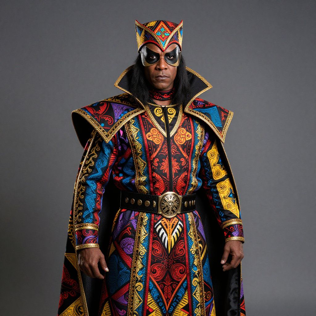 This striking image features a man dressed in a vivid Brother Voodoo costume, showcasing intricate patterns and bold colors. The costume is complemented by a dramatic cape, evoking the mystique and power associated with the character known for his connection to voodoo magic in comic books.