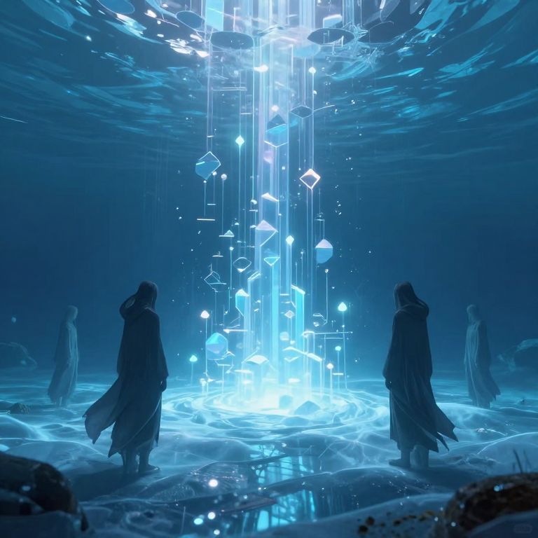 Beneath the icy expanse, a luminous realm pulses with ethereal columns of light, where figures gather amidst a surreal landscape of glowing beams and rocky shores, defying the boundaries of reality.