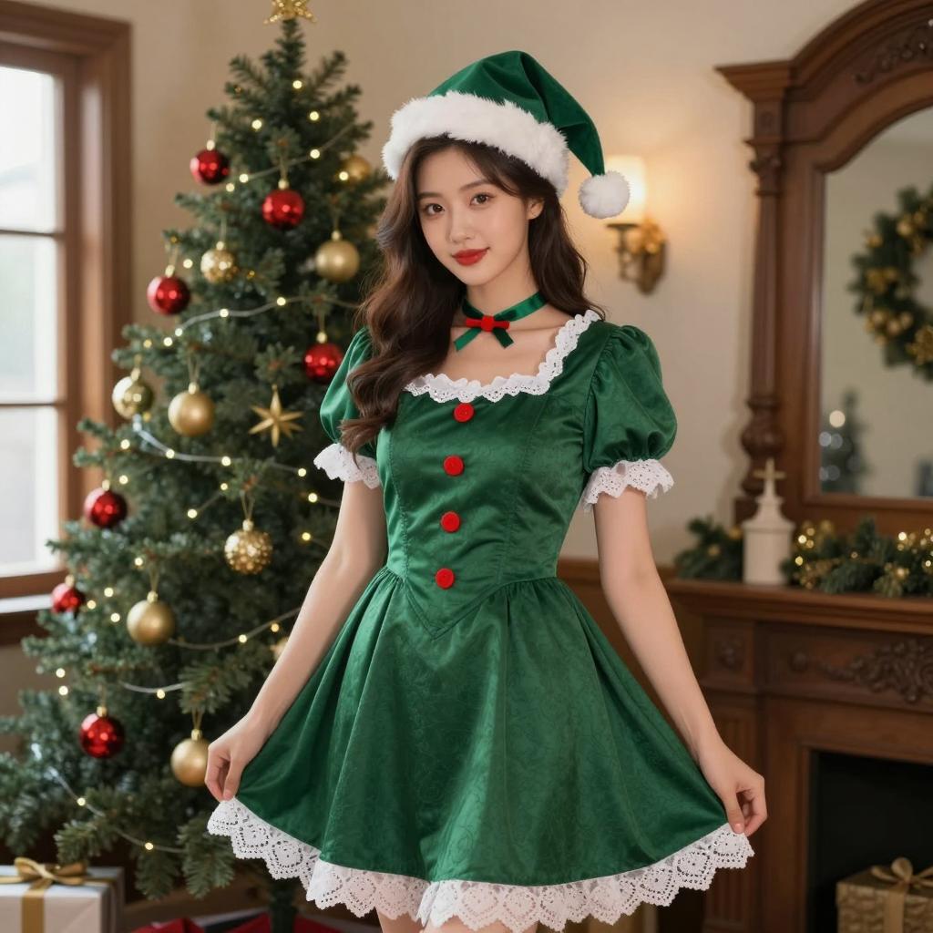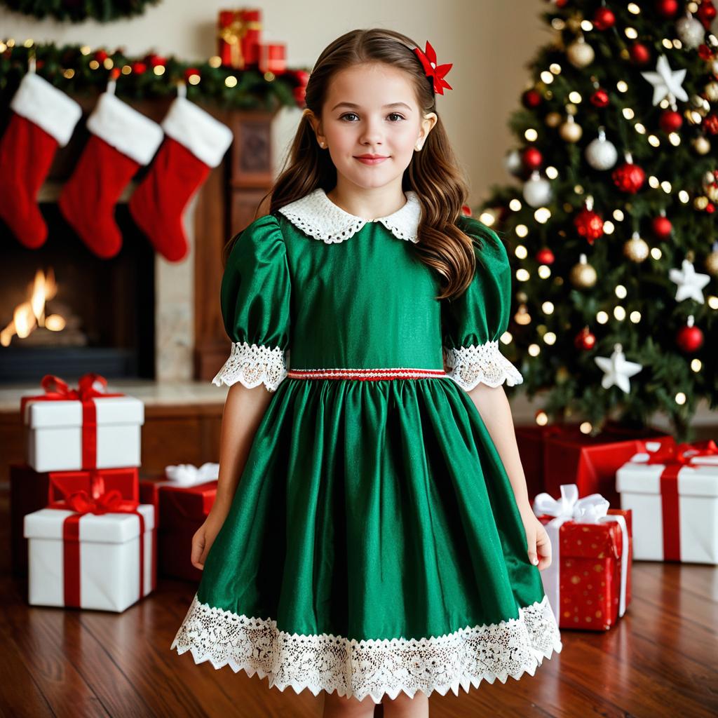 Nice dress christmas day, photorealistic, Christmas-themed photograph, young woman, long brown hair, hair bun with red bow, green long-sleeve dress, red ribbon around waist, white lace trim on dress hem, Christmas tree background, decorated with lights and ornaments, star on top, red ribbons on tree, wrapped presents with red and white ribbons, large window, daylight outside, soft lighting, indoor setting, festive atmosphere, warm colors, medium shot, standing pose