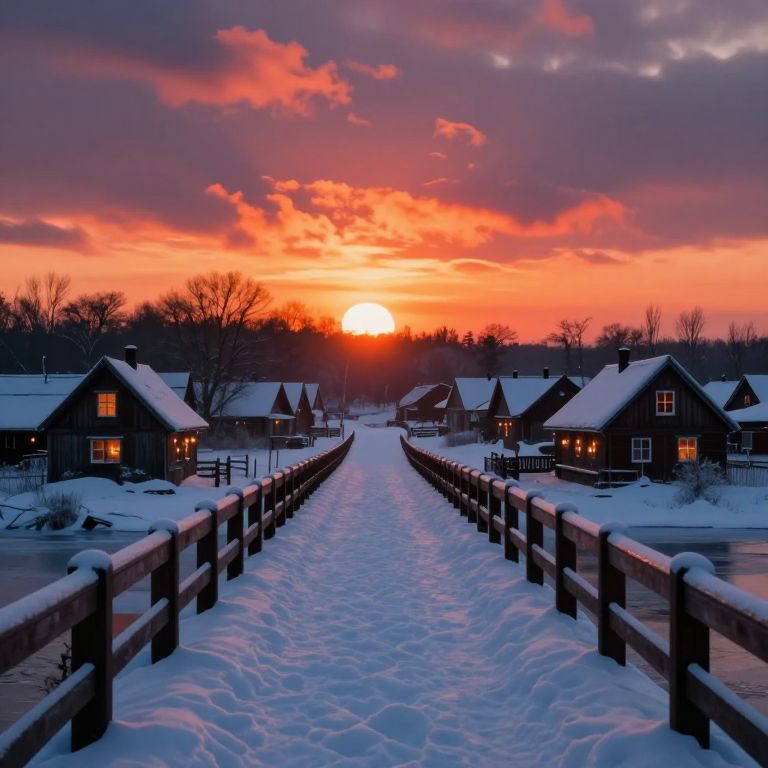 A surreal winter scene where a fiery sunset erupts from the horizon, casting molten hues across a snow-covered bridge that defies the cold, creating an otherworldly path between silent, candlelit houses.