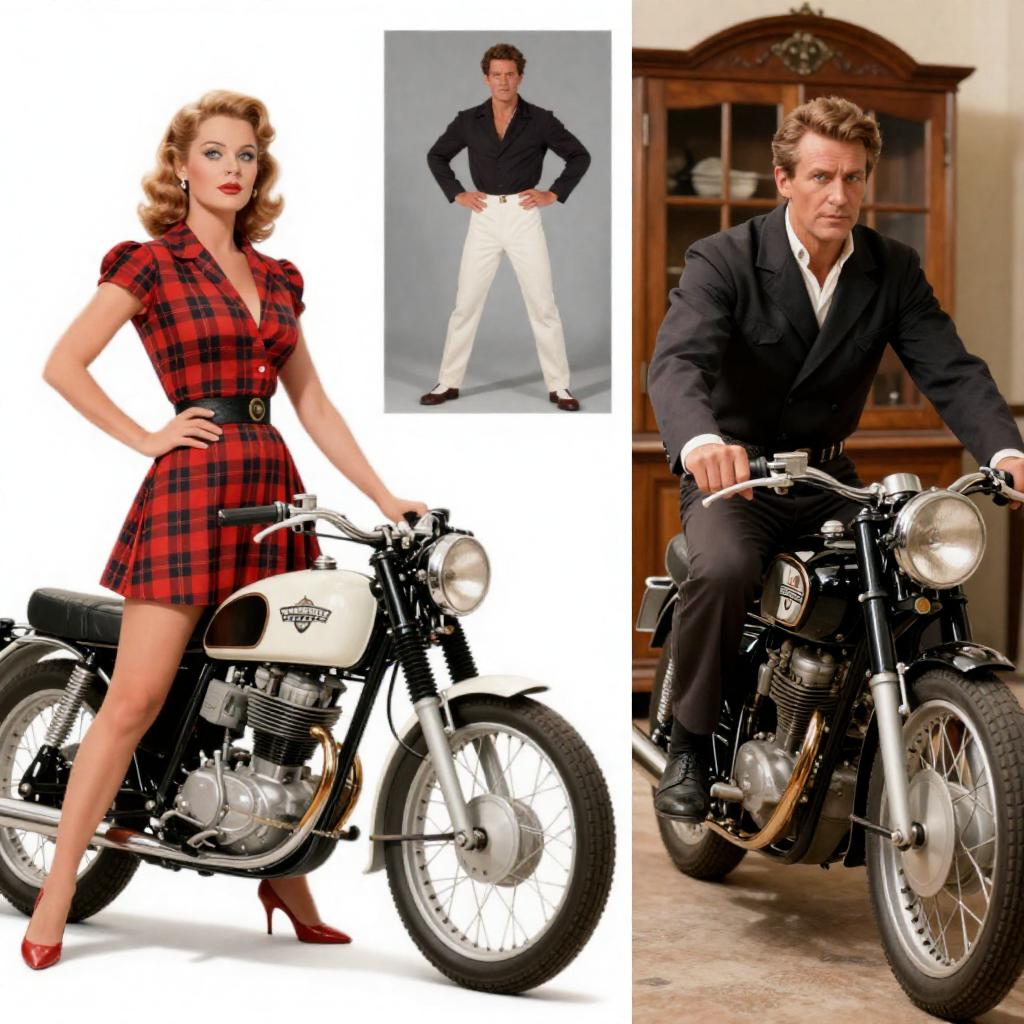 Photograph collage: vintage movie poster on left with a woman in a red plaid dress, black-and-white motorcycle illustration, and "Evel Knievel." Right side shows a man in dark clothing riding a vintage motorcycle in front of a wooden cabinet. Smaller inset image of Evel Knievel in white pants.
