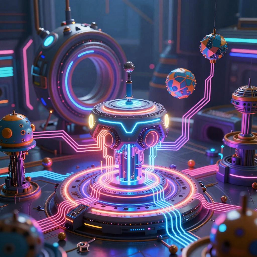 AI graphics generator creating vibrant futuristic digital art, glowing neon circuits intertwining with surreal geometric shapes, high-tech cybernetic environment, sharp details, vivid color palette, ultra-realistic 3D render, ambient sci-fi lighting.