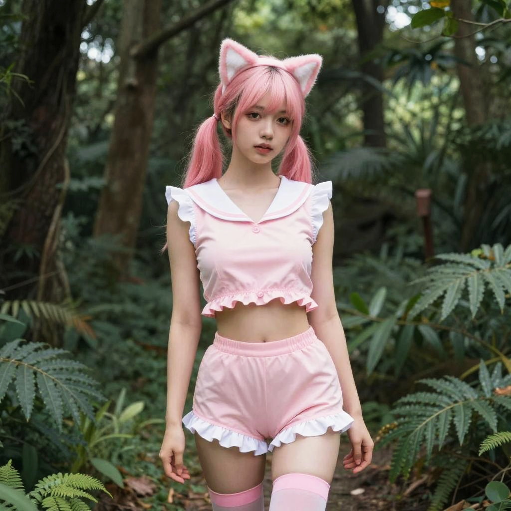 Photograph of a young woman with white fox ears, wearing a blue sweater, blue panties, and thigh-high blue socks, standing against a plain white