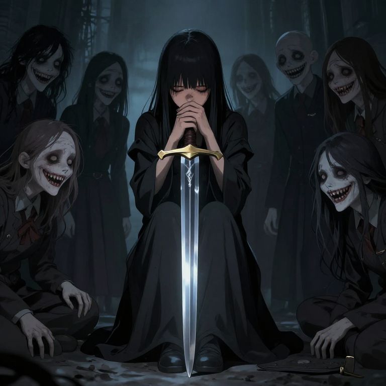 A dark, digital illustration depicts a young woman with long black hair and bangs, kneeling and covering her face with her hands while holding a glowing sword. She wears a black dress and has a gold bracelet on her right wrist. Surrounding her are six eerie, grinning figures with pale skin and black, hollow-eyed faces, wearing dark clothing. The background is dimly lit with a blue hue, suggesting a shadowy, forested area. The figures' sinister smiles contrast with the woman's tense, protective stance. The overall mood is ominous and dramatic, highlighting themes of fear and protection.