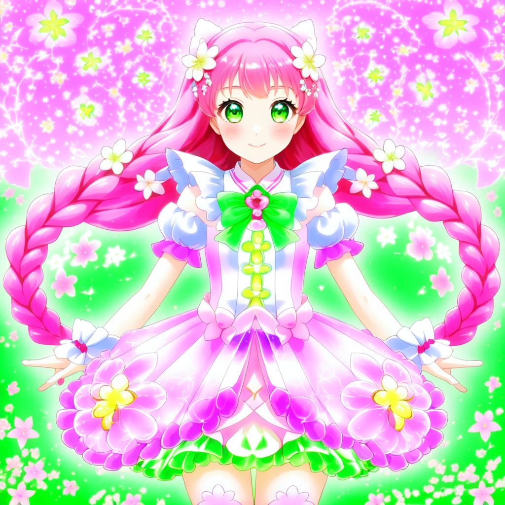 Brightly colored anime illustration of a magical girl with long pink twin braided hair adorned with white flowers. She has vivid green eyes, a frilly pink and green dress decorated with flowers, and a cheerful expression. The background features pink and green floral motifs, evoking a magical, springtime atmosphere.