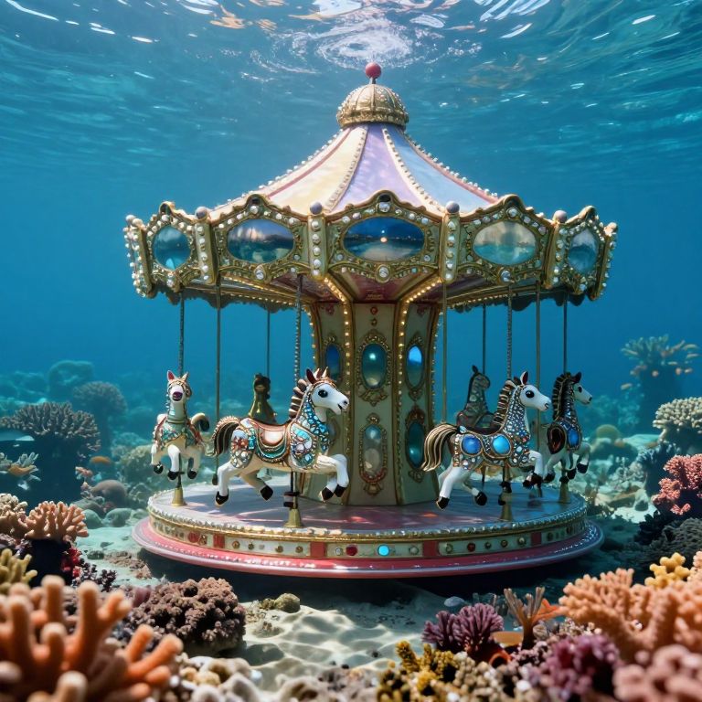 Dive into a surreal aquatic domain where the boundary between nature and fantasy dissolves effortlessly. From an extraordinary vantage point reminiscent of observing through an insect's eye, explore a vivid coral reef landscape. Amidst this vibrant seascape, a carousel appears enigmatically, its peculiarly deformed yet alluring creatures crafted exclusively from gleaming jewels and metals. As light penetrates the water, it creates mesmerizing shadows on both the carousel and its surrounding marine inhabitants, eliciting an emotional range from curiosity to absolute bewilderment with this fantastical blend of a natural underwater world and a whimsical mechanical marvel.