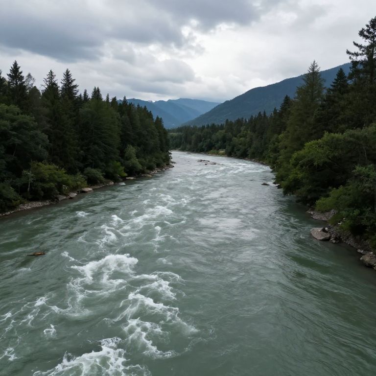 Crystal-clear turquoise waters meander through a serene forested valley, flanked by jagged rock formations and towering evergreens under a soft, cloud-dotted sky.