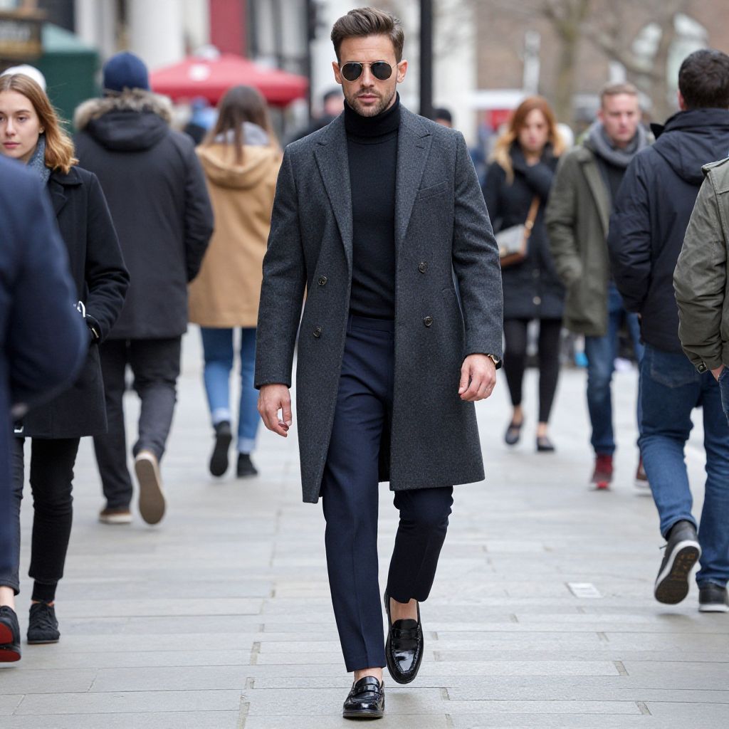 Stylishly dressed man strides confidently down a bustling London street during Men's Fall/Winter 2017 Fashion Week, showcasing a chic ensemble of a charcoal overcoat, navy trousers, black turtleneck, and polished loafers, while surrounded by pedestrians in varied winter attire.