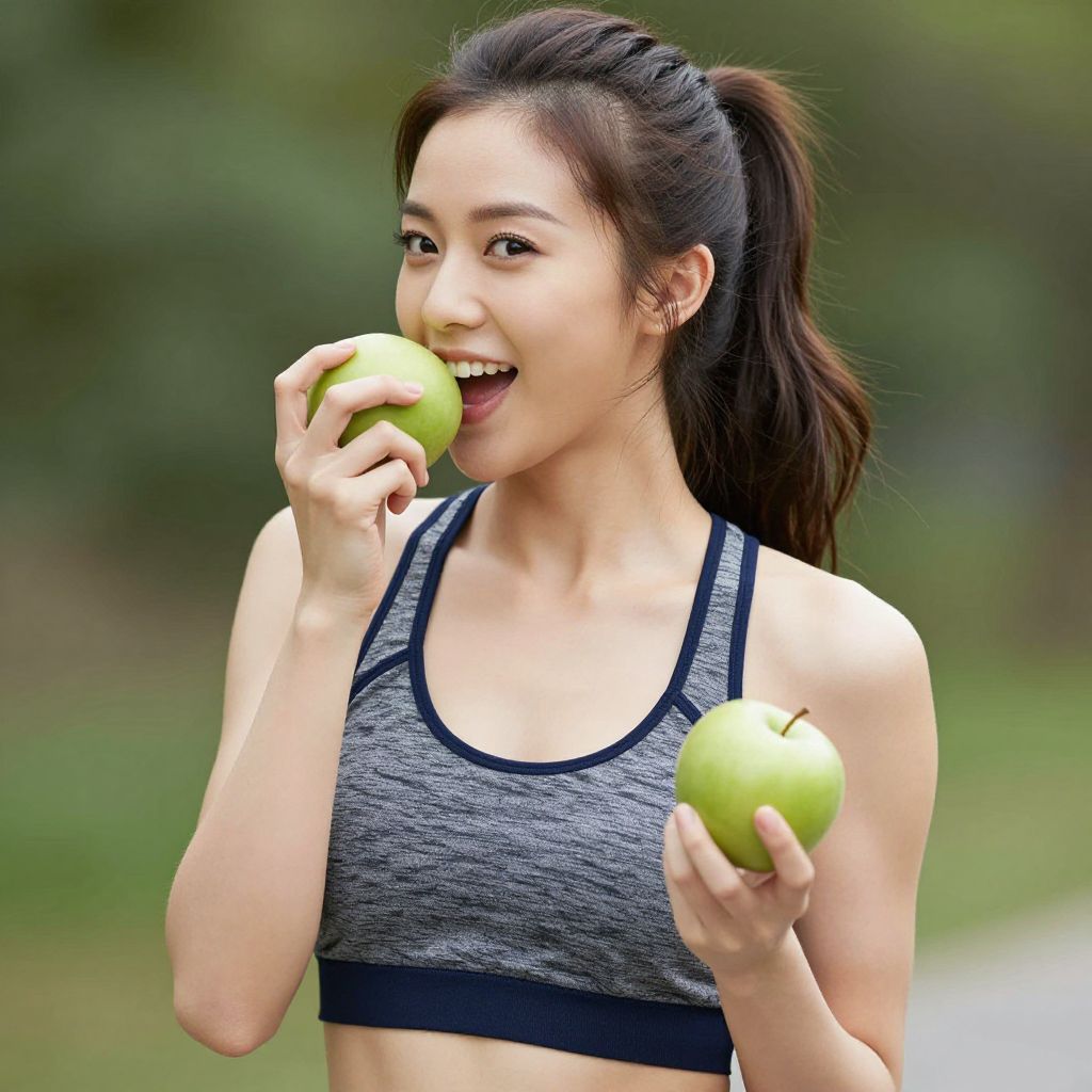 Photograph of an Asian woman with long black hair in a ponytail, wearing a gray sports bra, smiling while eating a green apple, holding another