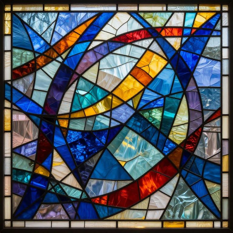 Abstract stained glass designs showcasing a fusion of angular and curvilinear elements, with contrasting colors blending seamlessly to create a visually striking mosaic, conveying movement and energy through layered glass panels and radiant light diffusion.
