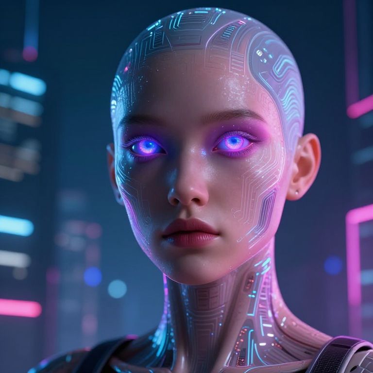 AI photo generator crafting a portrait of an android with human-like features, intricate circuits visible beneath translucent skin, soft glowing eyes, digital elements blending into a soft, pastel background, combining realism with sci-fi aesthetics in high resolution.